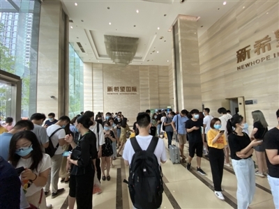 排隊等候的人群 在11樓上班,每天爬樓梯;排隊半小時,仍然上不到電梯……近日,有網(wǎng)友稱,位于成都天府三街的新希望國際大廈的電梯,是“成都最堵電梯”。這個“成都最堵電梯”到底有多“堵”?7月7日,記
