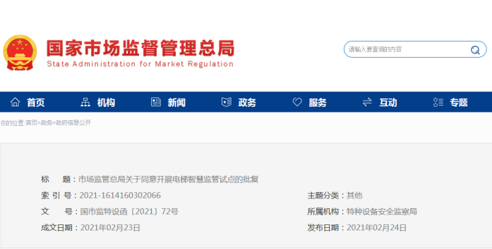 浙江新聞客戶端 |記者 李睿 通訊員 趙文瓊 近日,市場監(jiān)管總局發(fā)文《市場監(jiān)管總局關(guān)于同意開展電梯智慧監(jiān)管試點的批復(fù)》,在上海市、南京市、杭州市、廣州市開展首批電梯智慧監(jiān)管試點。 近年來,杭州加快打造