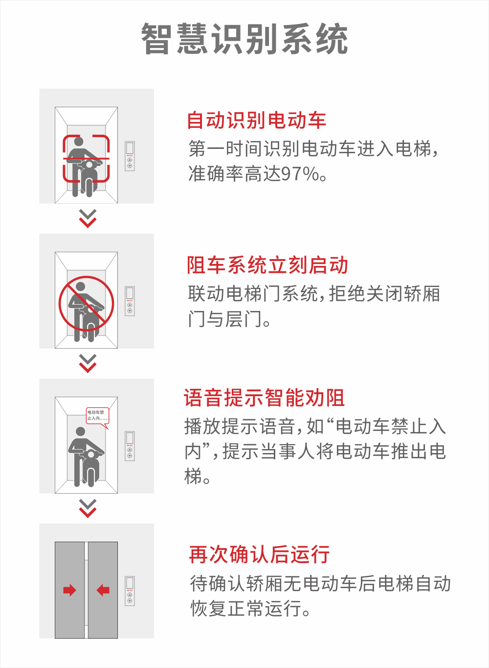 為了防止電動車進入電梯,西尼推出了一種“防電動車上樓梯控系統(tǒng)”,客戶選用該裝置后,只要有人推電動車(嬰兒車、輪椅不受影響)進電梯,電梯根據(jù)成像識別電動車進入,電梯馬上停止運行并發(fā)出警報,提示當(dāng)事人將電動車推出轎廂。待系統(tǒng)確認轎廂內(nèi)無電動車后,自動恢復(fù)正常運行。