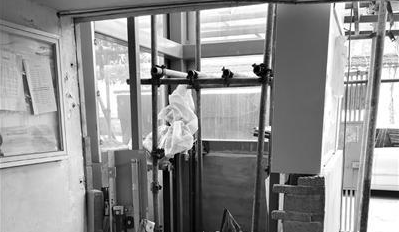 踩著單元樓門口墊著的鐵板、木板走進(jìn)去,我發(fā)現(xiàn),原本的電梯井成了“雜物間”,堆放著各種編織袋、泡沫紙。我一直從1樓走到7樓,發(fā)現(xiàn)每個樓層間的樓梯拐角處,都擺放著安裝電梯所需要的部件,上面蒙著一層厚厚的灰。
