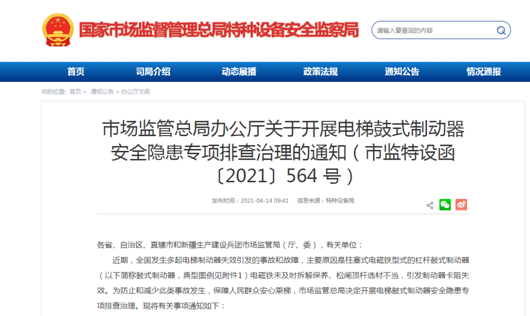 為切實(shí)落實(shí)電梯安全主體責(zé)任,提高電梯維保質(zhì)量和安全水平,預(yù)防和減少電梯事故發(fā)生,保障人民群眾安心乘梯。市場(chǎng)監(jiān)管總局近日發(fā)布通知,要求在全國(guó)范圍內(nèi)開展電梯鼓式制動(dòng)器安全隱患專項(xiàng)排查治理。此次專項(xiàng)排查治理是2021年總局“安心乘梯守護(hù)行動(dòng)”重要舉措之一,也是落實(shí)總局黨組黨史學(xué)習(xí)教育“我為群眾辦實(shí)事”的具體表現(xiàn)。