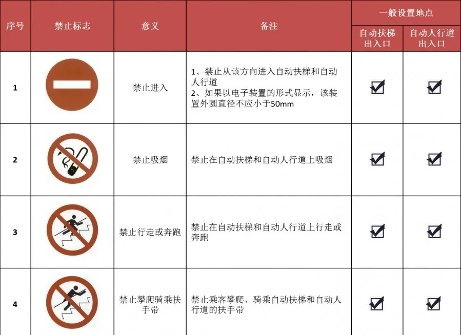 自動(dòng)扶梯和自動(dòng)人行道乘用安全標(biāo)志主要分為禁止標(biāo)志、警告標(biāo)志、指令標(biāo)志和提示標(biāo)志等,它們通常簡(jiǎn)單易懂、一目了然,以圖標(biāo)的形式設(shè)置在危險(xiǎn)或醒目位置。大家在乘坐自動(dòng)扶梯和自動(dòng)人行道時(shí)要悉心留意這些圖形標(biāo)志,嚴(yán)格遵守相關(guān)要求,保證自身人身安全。