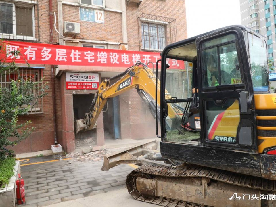 在老舊小區(qū)中,住在高層的老年人上下樓非常不方便。對于這些老年人來說,加裝電梯就顯得尤為迫切。8月6日,大峪街道月季園東里社區(qū)成為了門頭溝區(qū)首個加裝電梯的老舊小區(qū)。 施工現(xiàn)場,挖掘機正在對樓道外墻體進行
