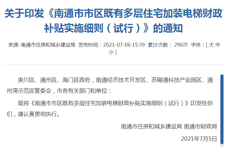 日前,南通市住建局和財(cái)政局聯(lián)合出臺(tái)了《南通市市區(qū)既有多層住宅加裝電梯財(cái)政補(bǔ)貼實(shí)施細(xì)則(試行)》,按照規(guī)定海門區(qū)也從8月15日起施行。 按照《實(shí)施辦法》,加裝電梯且樓層數(shù)達(dá)四層及以上的,經(jīng)申請(qǐng)予以電梯所