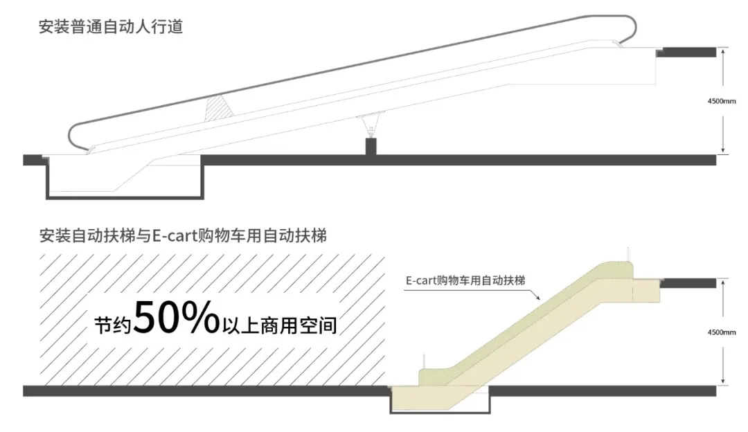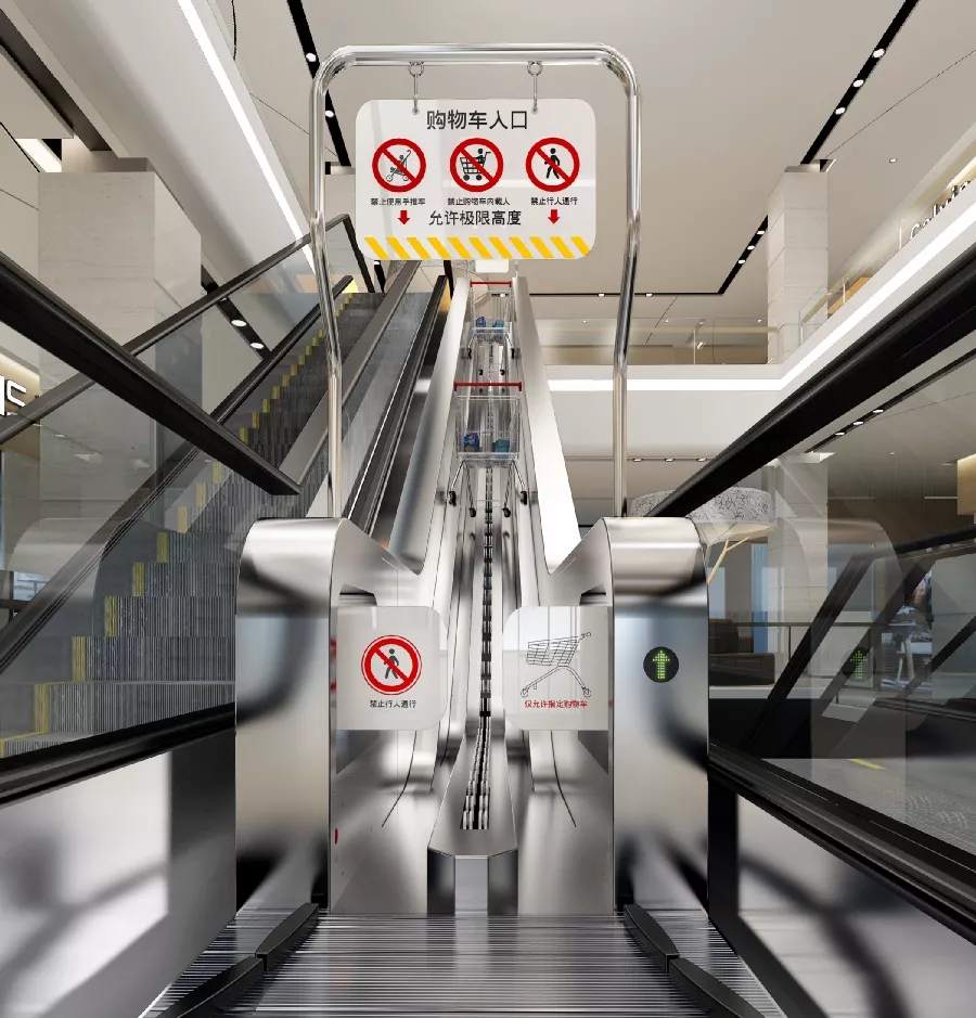 E-cart購物車用自動扶梯為購物車專用通道,有效防止并消除顧客手推購物車上自動扶梯所存在的較大安全隱患。該扶梯與常規(guī)自動扶梯角度同步運行(30°、35°),與常規(guī)扶梯并行安裝并配合使用。使得顧客與購物車分別同步使用上下專用扶梯通道,讓顧客購物體驗更加的安全舒適、輕松便捷。